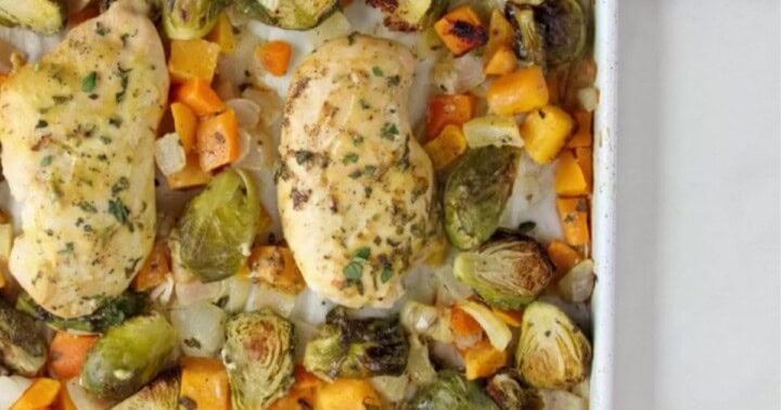 This sheet pan baked chicken dinner is so easy to make with a nice Dijon mustard maple sauce. Served with Brussels sprouts and butternut squash, and you have the perfect balanced dinner for you or your family. Cozy fall or winter paleo dinner option ready in under 30 minutes.