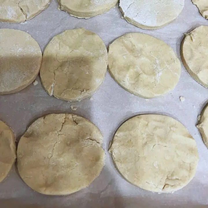 Form the dough into a square about 1 inch thick. Use a biscuit cutter or a round cookie cutter to cut out the biscuits. If you don't have a biscuit cutter, you can also drop pieces of dough directly onto the baking sheet for a more rustic look.
