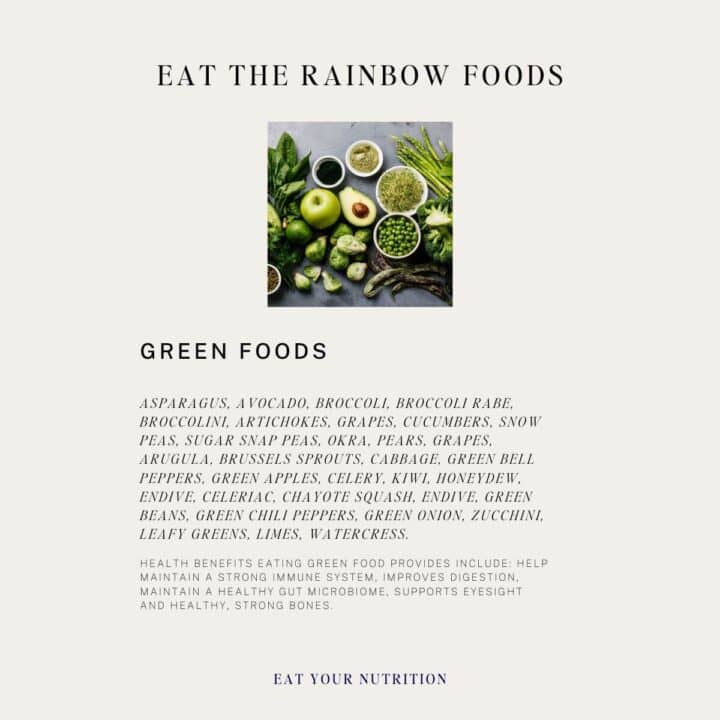 Check out the Eat the Rainbow chart at the end of this article to learn more health benefits that green foods provide for the body.