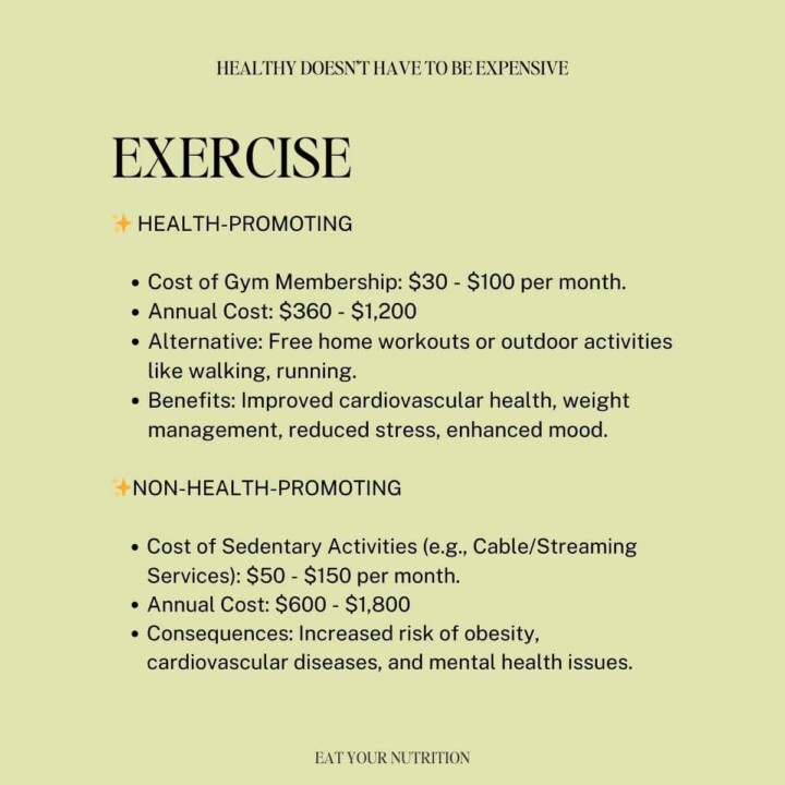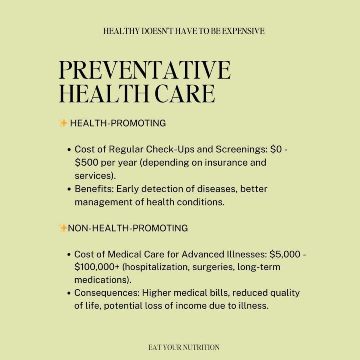 - Health-Promoting Costs: Regular check-ups and screenings: $0 - $500 per year (depending on insurance).