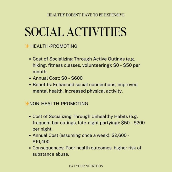 Conclusion: By being intentional about your social activities, you can create a fun, fulfilling social life that supports both your health and your wallet. Health-promoting activities such as hiking, group fitness, volunteering, and potlucks are excellent ways to socialize without the hefty financial and health consequences of frequent bar outings or late-night partying.