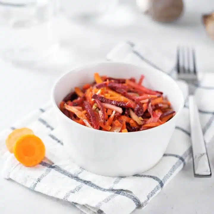 This carrot salad can be made with julienned, grated, or even shredded carrots and beets. Not only does the high fiber content in my easy carrot salad help balance hormones, especially if you suffer from estrogen dominance, but it tastes delicious too.
